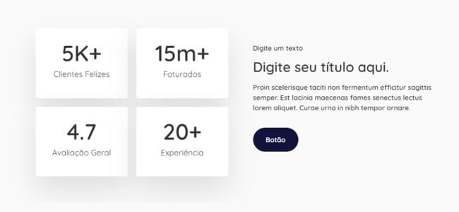 Clientes Felizes 0 K+ Faturados 0 m+ Avaliação Geral 0 Experiência 0 + Digite um texto Digite seu título aqui. Proin scelerisque taciti non fermentum efficitur sagittis semper. Est lacinia maecenas fames senectus lectus lorem aliquet. Curae urna in nibh tempor ornare. Botão