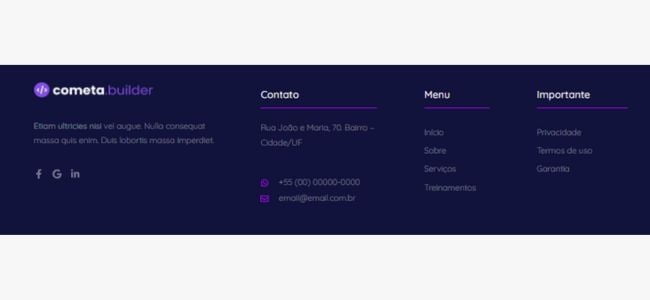 Etiam ultricies nisi vel augue. Nulla consequat massa quis enim. Duis lobortis massa imperdiet. Facebook-f Google Linkedin-in Contato Rua João e Maria, 70. Bairro – Cidade/UF +55 (00) 00000-0000 email@email.com.br Menu Início Sobre Serviços Treinamentos Importante Privacidade Termos de uso Garantia