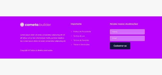 Lorem ipsum dolor sit amet, consectetur adipiscing elit. Ut elit tellus, luctus nec ullamcorper mattis, pulvinar dapibus leo. Lorem ipsum dolor sit amet, consectetur adipiscing elit. Copyright © Todos os direitos reservados. Importante Política de Privacidade Termos de uso Termos de Garantia Trocas e Devoluções Receba nossos atualizações!